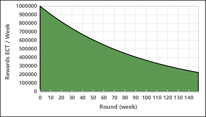 The slight decrease in the amount of rewards is offset by the expected long-term increase in the market value of the $ECT token. Ec³ DAO can make decisions to increase the current reward amount in case the reward curve is too low."